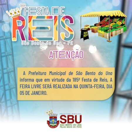 ATENÇÃO, POPULAÇÃO!!! A Prefeitura Municipal de São Bento do Una informa que em virtude da 185ª Festa de Reis, A FEIRA LIVRE QUE SERIA REALIZADA NO SÁBADO, DIA 07 DE JANEIRO DE 2023, SERÁ ANTECIPADA PARA A QUINTA-FEIRA, DIA 05 […]