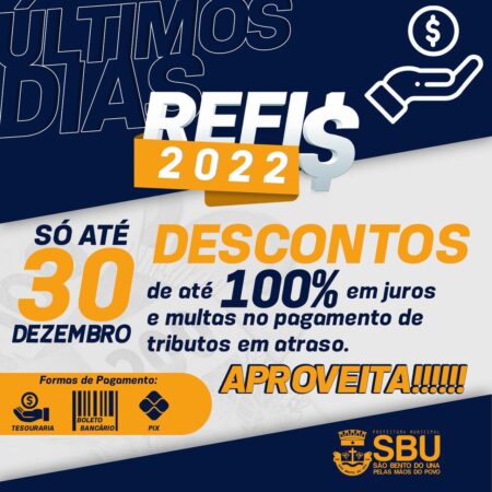 ATENÇÃO, ATENÇÃO, CONTRIBUINTES! O REFIS FOI PRORROGADO PARA NINGUÉM ENTRAR EM 2023 INADIMPLENTE!!! A Prefeitura Municipal de São Bento do Una, no intuito de minimizar os impactos financeiros que vêm atingindo os cidadãos são-bentenses, ainda ocasionados pelo efeito da pandemia, […]