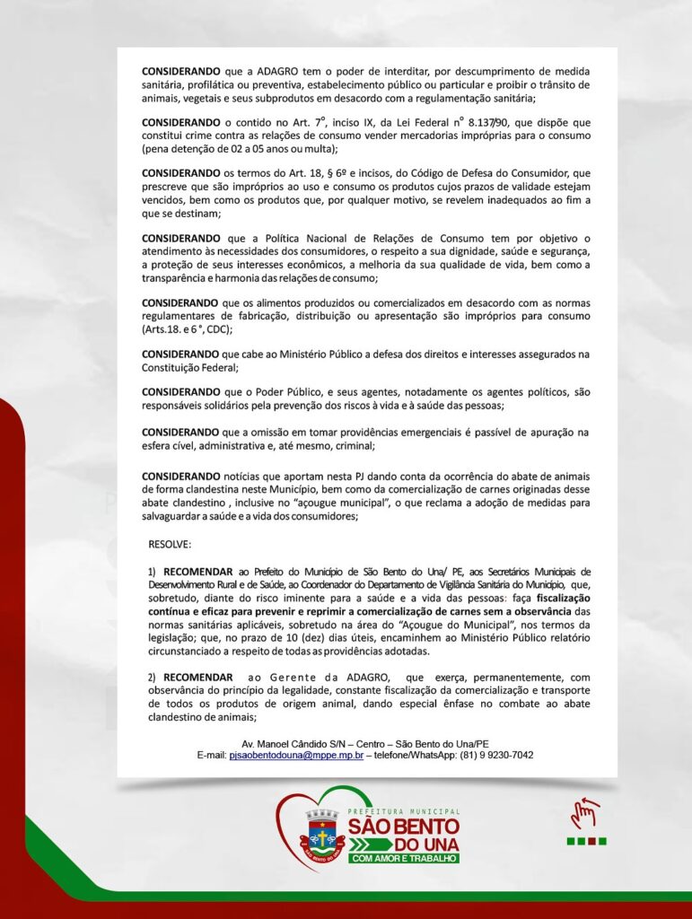 A Prefeitura de São Bento do Una, através da Secretaria de Desenvolvimento Rural, Sustentabilidade e Meio Ambiente, Secretaria de Saúde e do Departamento de Vigilância Sanitária, vem a público enfatizar que exerce permanentemente ações eficazes de controle e fiscalização, com o compromisso de reprimir a comercialização de carnes sem a devida observância das normas sanitárias, executando ações de vigilância sanitária que prezam pela prevenção de riscos à vida e à saúde das pessoas.