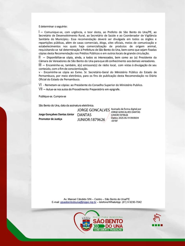 A Gestão Municipal destaca que está trabalhando em parceria com o MPPE, a ADAGRO e outros órgãos competentes para prevenir essas práticas e garantir a qualidade dos produtos oferecidos à população, e anuncia que: QUALQUER IRREGULARIDADE QUE SEJA CONSTATADA, SERÁ PRONTAMENTE COMUNICADA AO MPPE PARA AS PROVIDÊNCIAS CABÍVEIS.