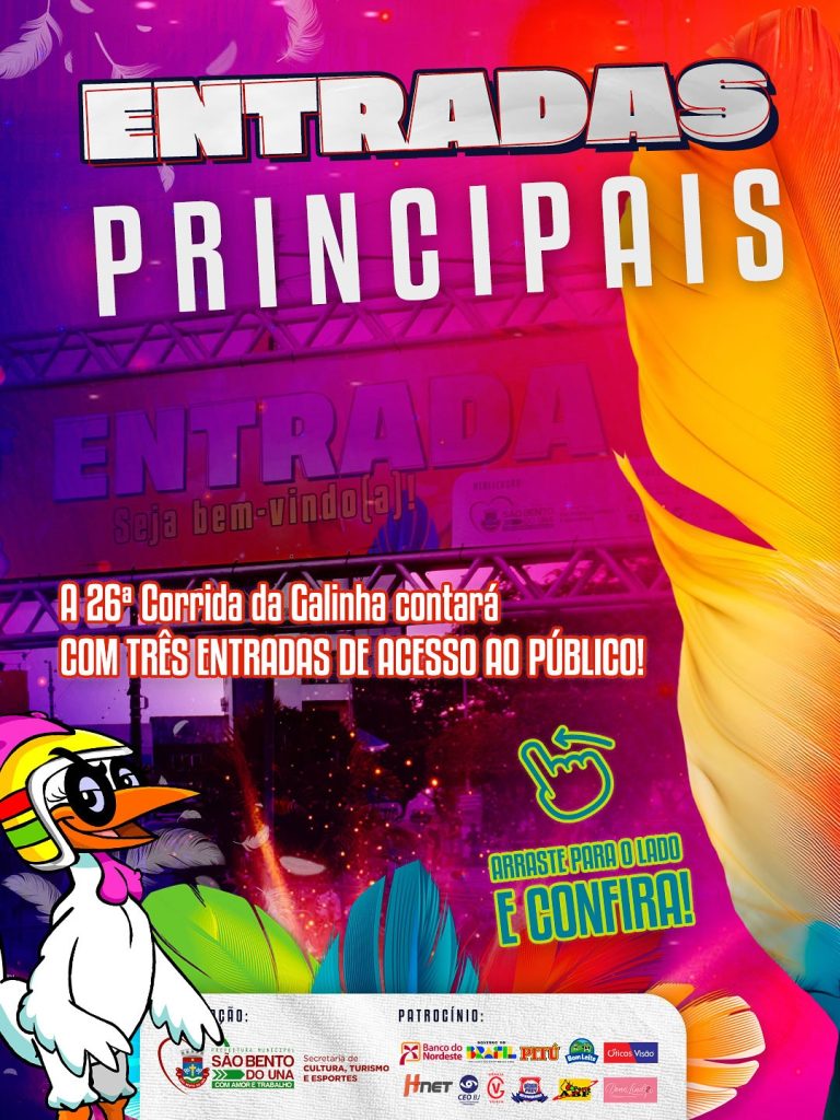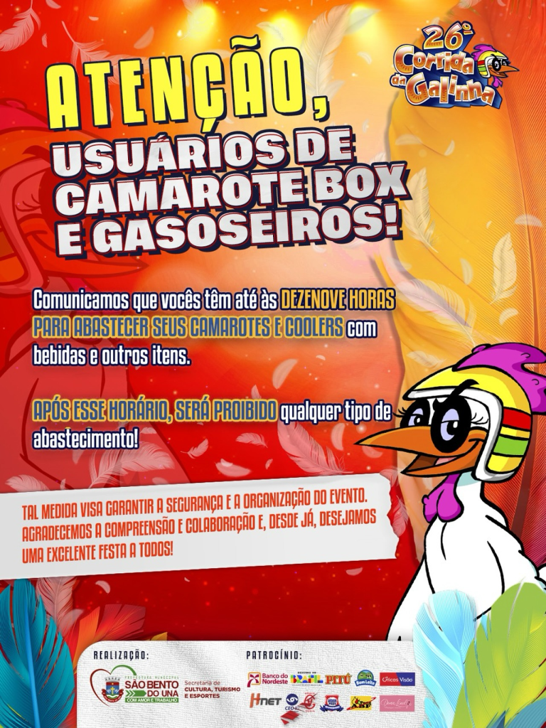 ATENÇÃO, FOLIÃO!!! A Prefeitura de São Bento do Una, através da Secretaria de Cultura, informa que para a 26ª edição da Corrida da Galinha, haverá TRÊS PONTOS DE ACESSO para garantir a sua comodidade e segurança. Fique atentos aos locais […]