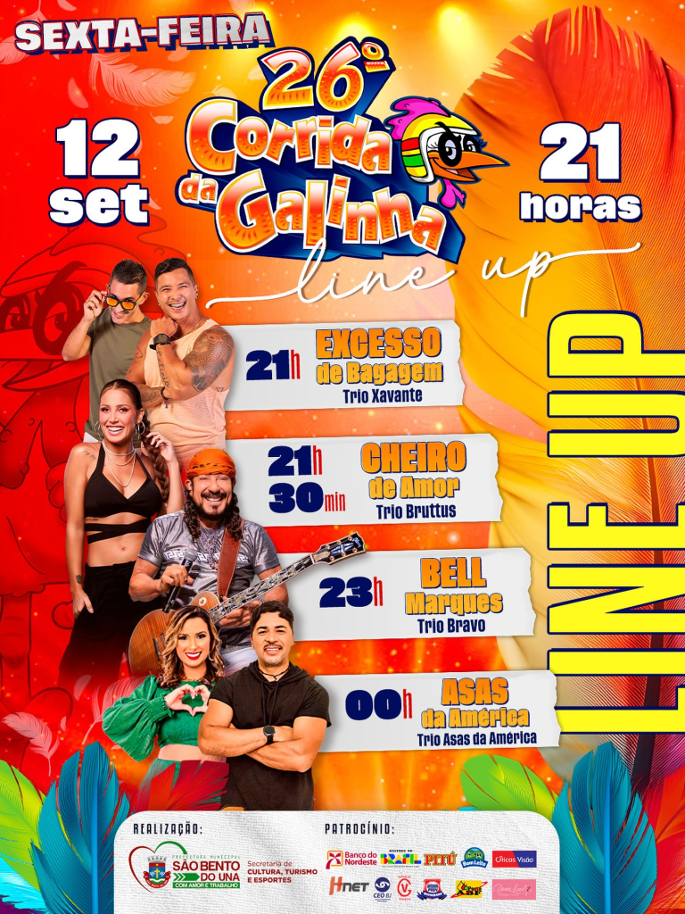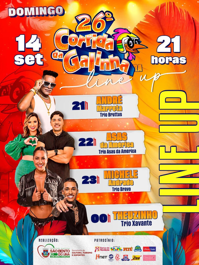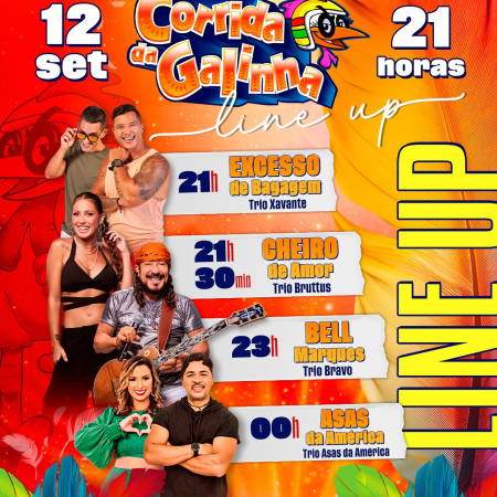 OLÁ, FOLIÃO DE PLANTÃO!!! Confira novamente a grade das atrações que vão fazer bombar a ULTIMA NOITE DA 26ª CORRIDA DA GALINHA: DOMINGO, 14/09: André Marreta- 21h; Asas da América- 22h; Michele Andrade- 23h; Theuzinho- 00h.