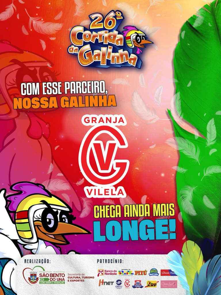 ALÔ, SEGUIDOR!!! A TRANSMISSÃO DAS TRÊS NOITES DA 26ª CORRIDA DA GALINHA SERÁ REALIZADA PELAS REDES SOCIAIS DA PREFEITURA DE SÃO BENTO DO UNA, AO VIVO, A PARTIR DAS 21h. Não perca!