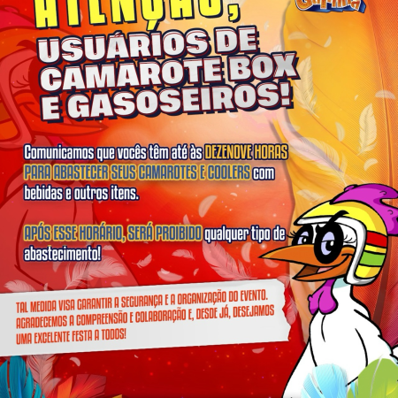 INFORMATIVO URGENTE: Comunicamos que vocês têm até às DEZENOVE HORAS PARA ABASTECER SEUS CAMAROTES E COOLERS com bebidas e outros itens. APÓS ESSE HORÁRIO, SERÁ PROIBIDO qualquer tipo de abastecimento! Tal medida visa garantir a segurança e a organização do […]