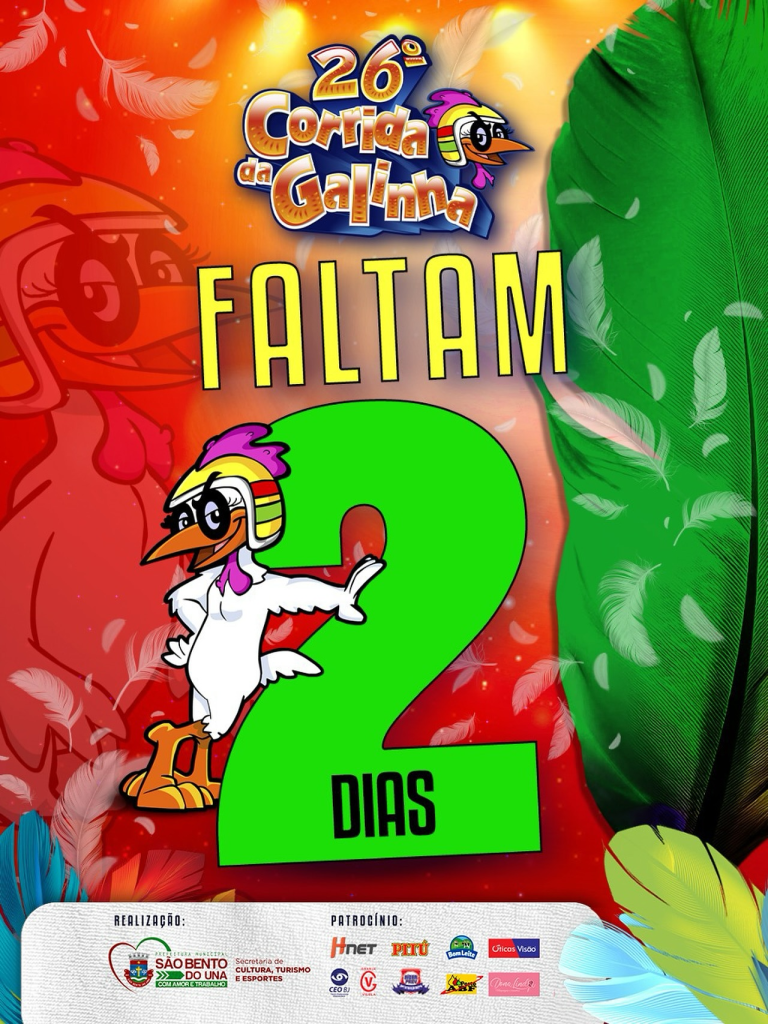 ALÔ, FOLIÃO!!! FALTAM APENAS 2 DIAS para a maior e melhor Corrida da Galinha de todos os tempos! Tá chegando a hora! ”Estou feliz, com o coração palpitando…”