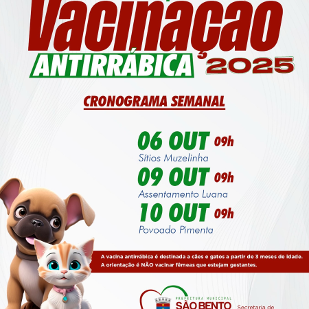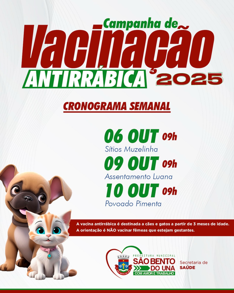 06/10– 9h: Sítio Muzelinha. 09/10– 9h: Assentamento Luana. 10/10– 9h: Povoado da Pimenta. ORIENTAÇÕES IMPORTANTES: A vacina é destinada a cães e gatos a partir dos 3 meses de idade. NÃO é permitido vacinar FÊMEAS GESTANTES! A Prefeitura de São […]