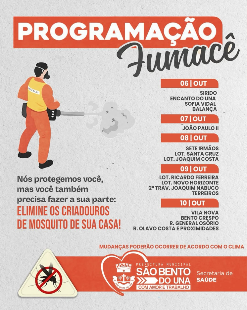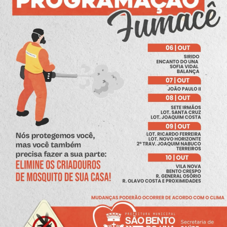 ⚠️ A Prefeitura de São Bento do Una, através da Secretaria de Saúde, informa o cronograma de ação do FUMACÊ no Município- Período de 06/10 a 10/10. 🚨O trabalho na luta contra os mosquitos vetores não pode parar! 📲Semanalmente, postaremos […]