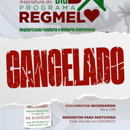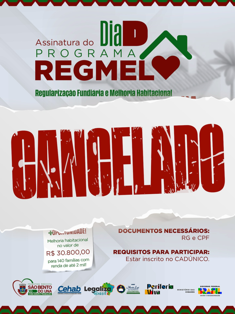 ATENÇÃO, MUNÍCIPES!!! A Prefeitura de São Bento do Una informa que o evento de assinaturas de adesão ao PROGRAMA REGMEL, previsto para esta terça-feira, 30 de setembro, foi CANCELADO! Assim que uma nova data for confirmada, será divulgada oportunamente!