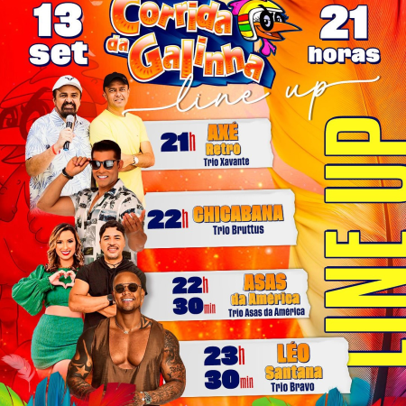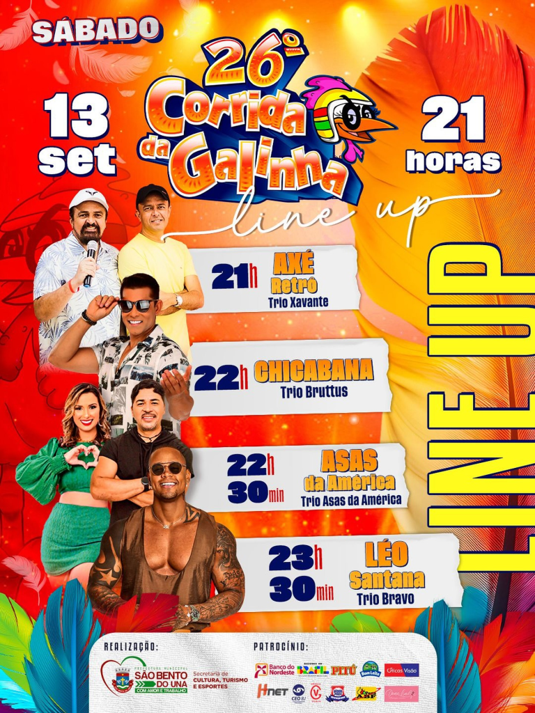 OLÁ, FOLIÃO DE PLANTÃO!!! Confira novamente a grade das atrações que vão fazer bombar a SEGUNDA NOITE DA 26ª CORRIDA DA GALINHA: SÁBADO, 13/09: A Barca Maluka (Bloco Pintinho na Folia)- 16h; Axé Retrô- 21h; Chicabana- 22h; Asas da América- […]