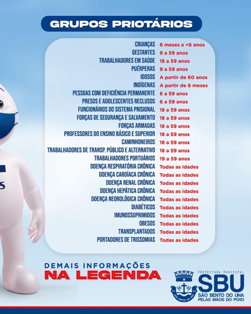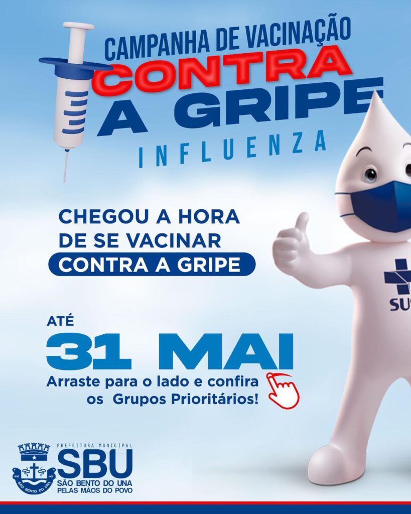 A Prefeitura de São Bento do Una, através da Secretaria de Saúde, e por meio do PNI local, comunica à população são-bentense que deu início à CAMPANHA DE VACINAÇÃO 2023 CONTRA A INFLUENZA.