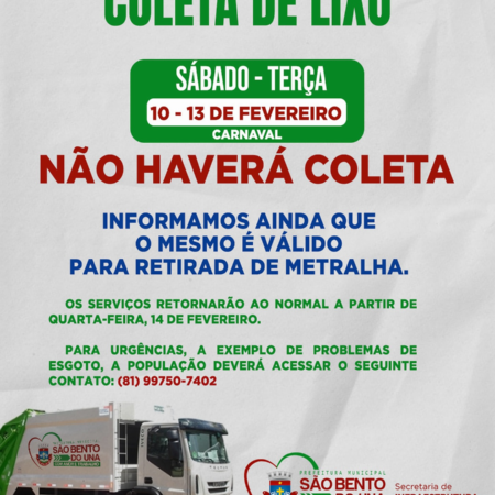 ATENÇÃO!!! A Prefeitura de São Bento do Una, através da Secretaria Municipal de Infraestrutura, informa que: Em virtude do Feriado de Carnaval, APÓS A FEIRA LIVRE DA PRÓXIMA SEXTA-FEIRA, O SERVIÇO DE COLETA DE LIXO SÓ RETORNARÁ ÀS ATIVIDADES NO […]