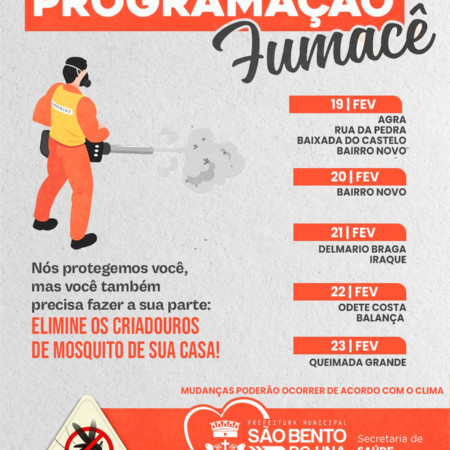A Prefeitura de São Bento do Una, através da Secretaria de Saúde, informa o cronograma de ação do FUMACÊ no Município/ Período de 19 a 23/02. O trabalho na luta contra o mosquito da Dengue não pode parar! É importante […]