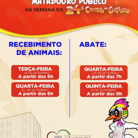 🔊 ATENÇÃO, POPULAÇÃO!!! 👉👉Informamos que, ao longo desta semana, haverá alteração no cronograma de recebimento e abate de animais, no Matadouro Público Municipal, em virtude da realização da 24ª CORRIDA DA GALINHA. 🔎Olho na imagem!!! #notíciassbu