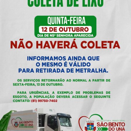 ⚠️ATENÇÃO, POPULAÇÃO!!! 📍Amanhã, DIA 12 DE OUTUBRO, NÃO HAVERÁ COLETA DE LIXO, EM VIRTUDE DO FERIADO DE NOSSA SENHORA APARECIDA. 📍Informamos ainda que o mesmo é válido para a RETIRADA DE METRALHA.Os serviços retornarão ao normal a partir da próxima […]