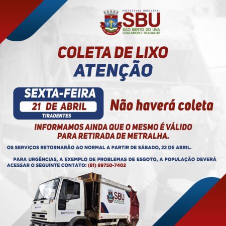 ATENÇÃO, POPULAÇÃO!!! A Prefeitura de São Bento do Una informa que OS SERVIÇOS DE RETIRADA DE METRALHAS E COLETA DE LIXO ESTARÃO SUSPENSOS AMANHÃ, DIA 21 DE ABRIL, EM VIRTUDE DO FERIADO DE TIRADENTES. #notíciassbu