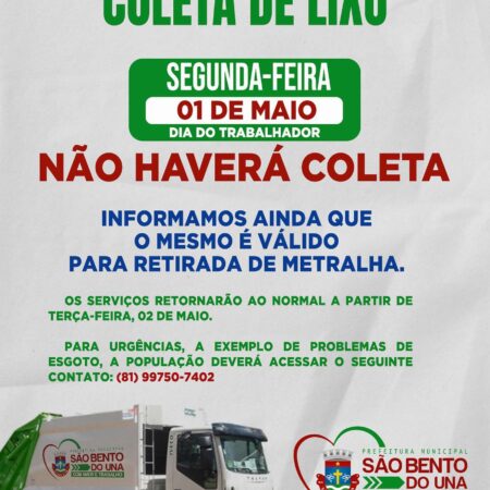 ATENÇÃO, POPULAÇÃO!!! A Prefeitura de São Bento do Una informa que OS SERVIÇOS DE RETIRADA DE METRALHAS E COLETA DE LIXO ESTARÃO SUSPENSOS AMANHÃ, 1º DE MAIO, EM VIRTUDE DO FERIADO DO DIA DO TRABALHADOR. #notíciassbu