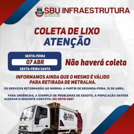 ATENÇÃO, POPULAÇÃO!!! A Prefeitura de São Bento do Una informa que OS SERVIÇOS DE RETIRADA DE METRALHAS E COLETA DE LIXO SERÃO SUSPENSOS NA PRÓXIMA SEXTA-FEIRA, EM VIRTUDE DO FERIADO DA PAIXÃO E MORTE DE JESUS CRISTO. A Gestão aproveita […]