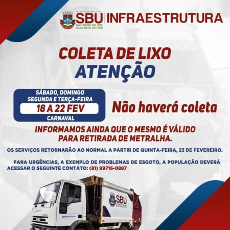 ATENÇÃO, POPULAÇÃO!!! A Prefeitura Municipal informa que NÃO haverá coleta do dia 18/02 (SÁBADO), até o dia 22/02 (QUARTA-FEIRA). #notíciassbu
