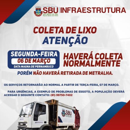 ATENÇÃO, POPULAÇÃO!!! Informamos que na próxima segunda-feira, DIAS 6 de Março, HAVERÁ COLETA DE LIXO NORMALMENTE, APESAR DO FERIADO DATA MAGNA DE PERNAMBUCO. Informamos ainda que O SERVIÇO DE RETIRADA DE METRALHAS VOLTARÁ AO NORMAL NA PRÓXIMA TERÇA, DIA 07/03. […]