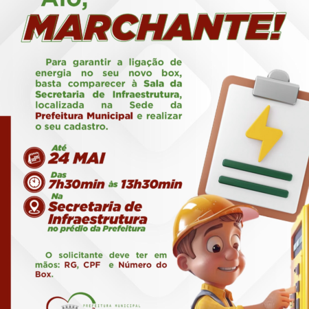 Para garantir a ligação de energia no seu novo box, basta comparecer à Sala da Secretaria de Infraestrutura, localizada na Sede da Prefeitura Municipal, até a próxima sexta-feira (24/05), das 7h30 às 13h30, e realizar o seu cadastro. No ato […]