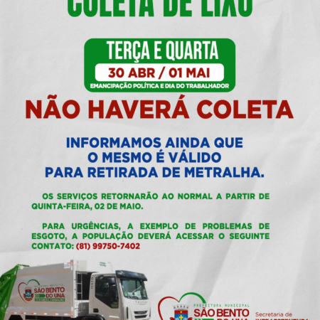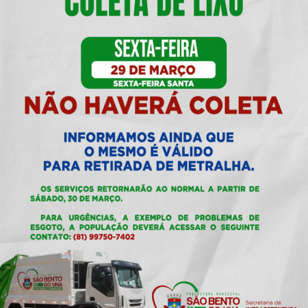 ATENÇÃO, POPULAÇÃO!!! A Prefeitura de São Bento do Una comunica que, em virtude das celebrações da SEMANA SANTA, OS SERVIÇOS DE COLETA DE LIXO E RETIRADA DE METRALHAS SÓ FUNCIONARÃO ATÉ O MEIO-DIA DA PRÓXIMA QUINTA-FEIRA (28/03). Excluem-se desta liberação […]