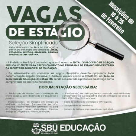 Atenção, Estudantes Universitários matriculados a partir do 2° PERÍODO DOS CURSOS DE LETRAS, PEDAGOGIA, HISTÓRIA, GEOGRAFIA, CIÊNCIAS BIOLÓGICAS E MATEMÁTICA: A Prefeitura Municipal comunica que está aberto o EDITAL DE PROCESSO DE SELEÇÃO PÚBLICA N° 001/22 PARA CREDENCIAMENTO NO PROGRAMA […]