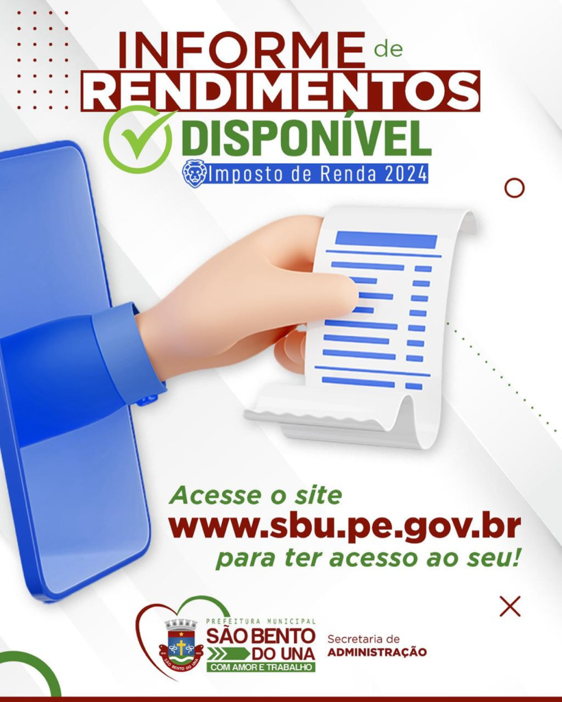 ATENÇÃO, SERVIDOR!!! A Prefeitura de São Bento do Una comunica que o INFORME DE RENDIMENTOS para a DECLARAÇÃO DO IR 2024 já está DISPONÍVEL no seguinte site: https://www.saobentodouna.pe.gov.br/contra-cheques #notíciassbu