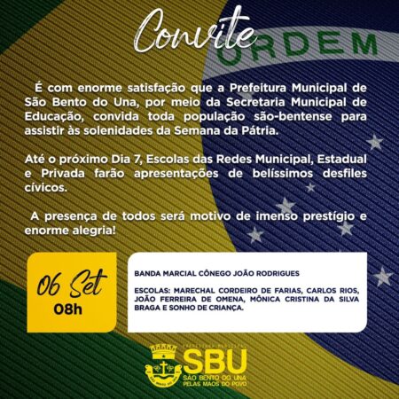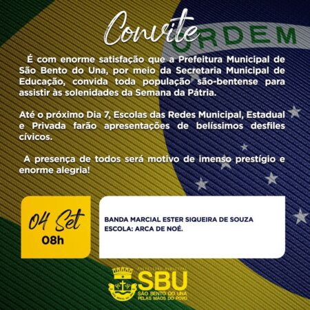 É com enorme satisfação que a Prefeitura Municipal de São Bento do Una, por meio da Secretaria Municipal de Educação, convida toda população são-bentense para assistir às solenidades da Semana da Pátria, na Praça Historiador Adalberto Paiva. Até o próximo […]