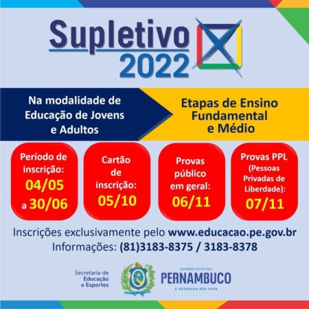 Atenção, atenção para o anúncio emitido pela Secretaria de Educação do Governo do Estado de Pernambuco: A Secretaria de Educação e Esportes divulga portaria que determina abertura de inscrições para Exame Supletivo 2022.Inscrições começam no dia 04 de maio para […]