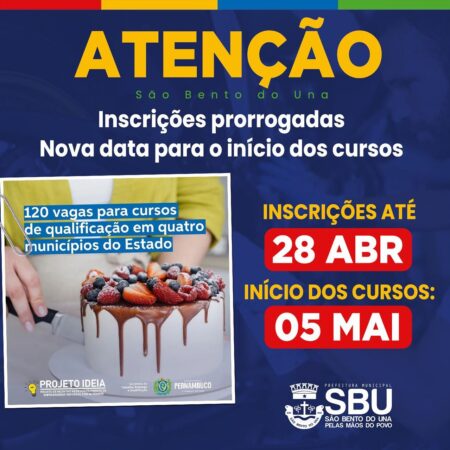 A Prefeitura Municipal de São Bento do Una informa que os cursos nas áreas de Mecânica e Manutenção de motos, e Cobertura e Recheios de Chantininho, que iriam começar na próxima segunda-feira, foram adiados para o dia 02/05, e as […]