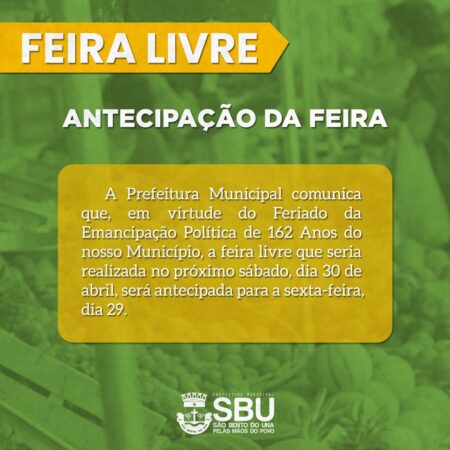 Atenção, população!!! A Prefeitura Municipal comunica que, em virtude do Feriado da Emancipação Política de 162 Anos do nosso Município, a feira livre que seria realizada no próximo sábado, dia 30 de abril, será antecipada para a sexta-feira, dia 29. […]