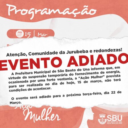 A Prefeitura Municipal de São Bento do Una informa que, em virtude da suspensão temporária do fornecimento de energia, ocasionada por uma forte ventania, a “Ação Mulher”, prevista para ser realizada no dia de hoje, 15 de março, não terá […]