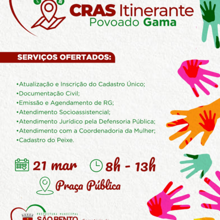 Alô, alô, povoado do Gama!!! No próximo dia 21, das 8h às 13h, a equipe do CRAS ITINERANTE estará aí com vocês ofertando os seguintes serviços: •Atualização e Inscrição do Cadastro Único; •Documentação Civil; •Emissão e Agendamento de RG; •Atendimento […]