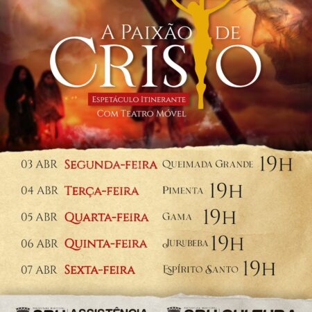 Experiências de fé foram vivenciadas ontem, dia 3 de abril, na primeira noite de espetáculo do “Teatro Itinerante da Paixão de Cristo”, ação promovida pela Gestão Municipal, por meio da Secretaria de Assistência Social. O intuito das encenações é relembrar […]