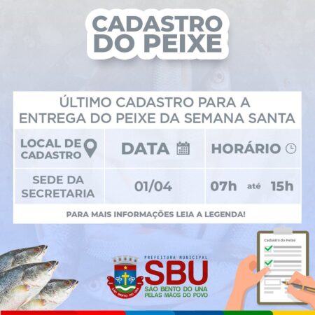 ATENÇÃO, POPULAÇÃO!!! A Prefeitura Municipal, por meio da Secretaria de Assistência Social, comunica que realizará O ÚLTIMO CADASTRAMENTO PARA A “ENTREGA DO PEIXE DA SEMANA SANTA”, NO PRÓXIMO SÁBADO, DIA 1° DE ABRIL, DAS 7h ÀS 15h, NA SEDE DA […]