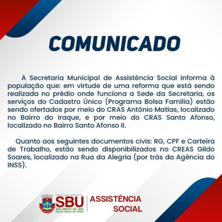 Atenção ao comunicado emitido pela Secretaria Municipal de Assistência Social! #notíciassbu