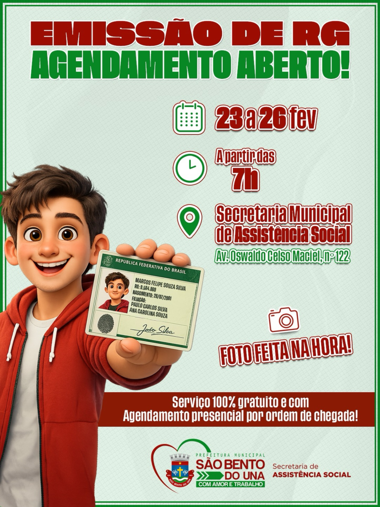 Atenção, população! A Prefeitura de São Bento do Una, por meio da Secretaria Municipal de Assistência Social, informa que estão abertas as novas datas de agendamento para emissão de RG. De 23 a 26 de fevereiro A partir das 7h […]