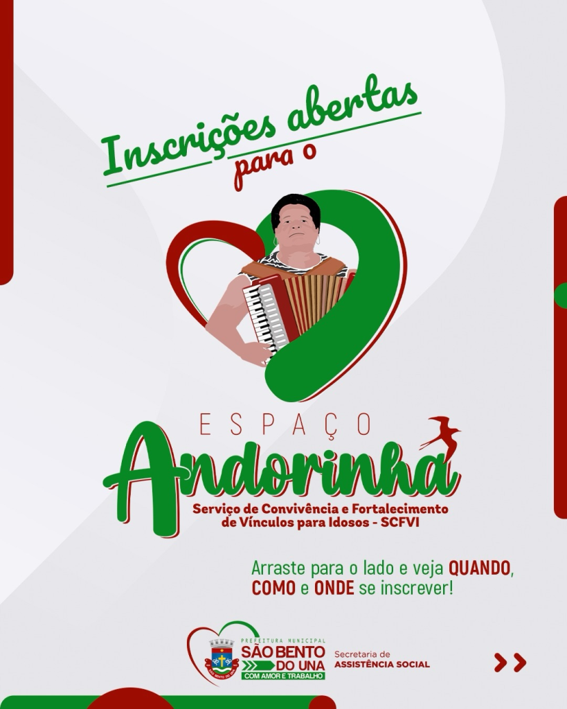ATENÇÃO, QUERIDOS IDOSOS DE SÃO BENTO DO UNA! A Prefeitura de São Bento do Una, por meio da Secretaria de Assistência Social, informa que estão abertas as inscrições para o “Espaço Andorinha”, Serviço de Convivência e Fortalecimento de Vínculos do […]