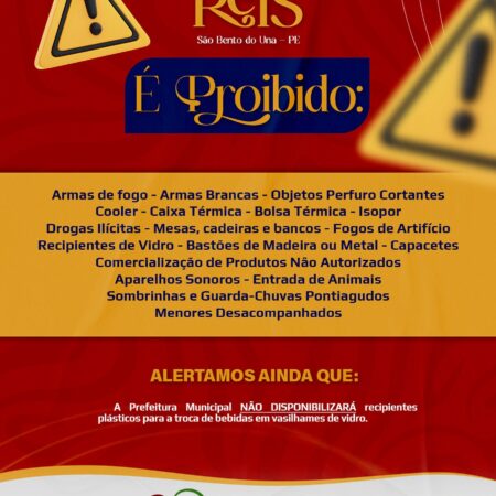 ATENÇÃO, POPULAÇÃO!!! Em reunião entre a Prefeitura de São Bento do Una, as Forças de Segurança Pública e o Poder Judiciário, FICARAM DETERMINADAS, através de Termo de Ajuste de Conduta, as seguintes PROIBIÇÕES NA 186ª Festa de Reis: -Armas de […]