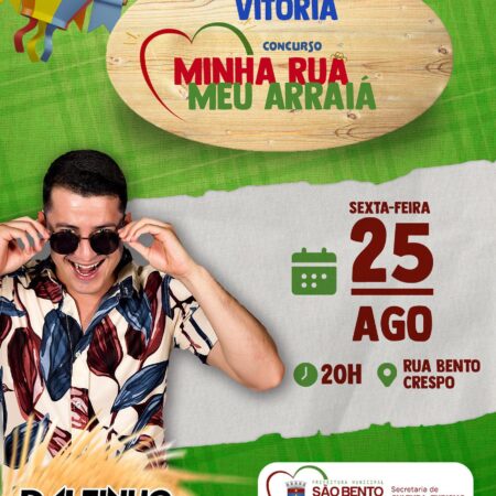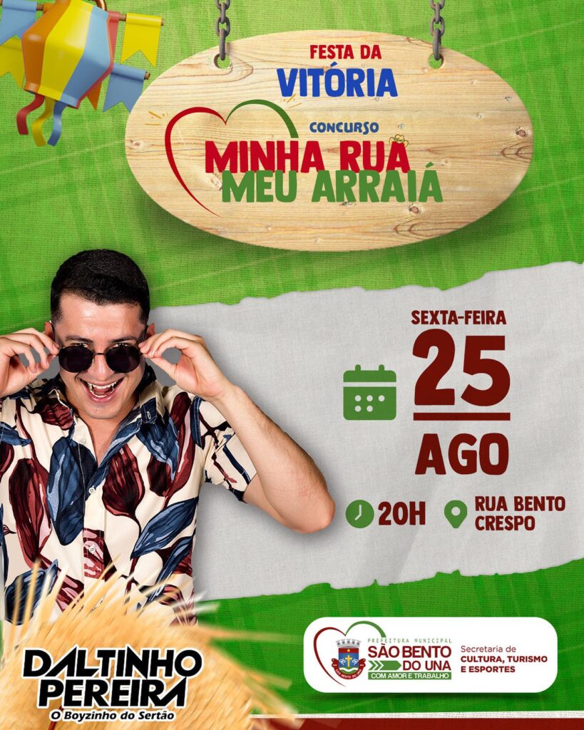 A Prefeitura de São Bento do Una, por meio da Secretaria de Cultura, anuncia que amanhã, DIA 25 DE AGOSTO, DALTINHO PEREIRA VAI ANIMAR A FESTA DE PREMIAÇÃO DO CONCURSO “MINHA RUA, MEU ARRAIÁ”, ÀS 20H, NA RUA BENTO CRESPO, […]