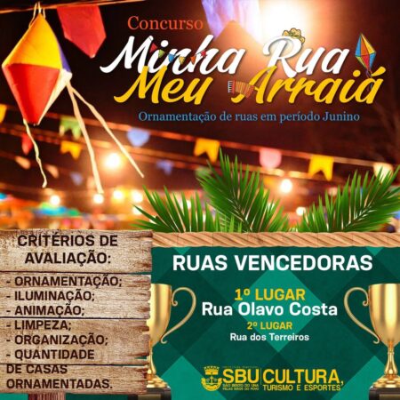 A Prefeitura Municipal, por meio da Secretaria de Cultura, parabeniza as Ruas Olavo Costa e Terreiros pelo show de ornamentação, organização, iluminação, animação e limpeza que deram, abrilhantando o Concurso: “Minha Rua, Meu Arraiá”, Edição 2022. #notíciassbu