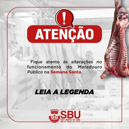 ATENÇÃO, POPULAÇÃO!!! A Prefeitura de São Bento do Una, através da Secretaria de Desenvolvimento Rural, informa que haverá alteração no cronograma de abate e recebimento de animais desta semana, em virtude do FERIADO DE SEMANA SANTA. CONFIRAM: RECEBIMENTO DE ANIMAIS: […]