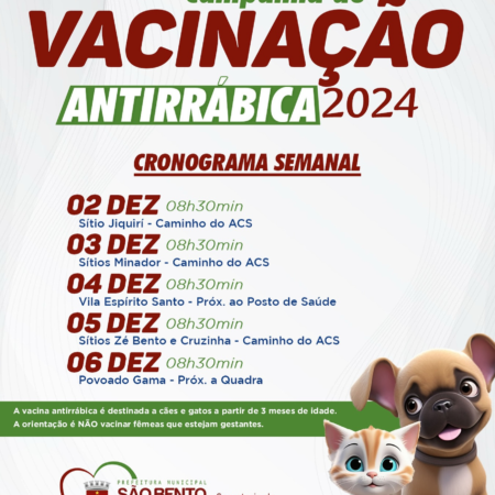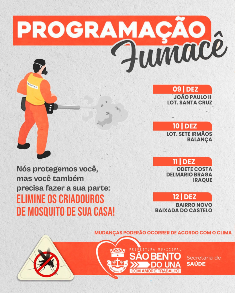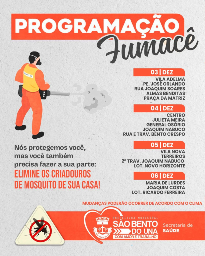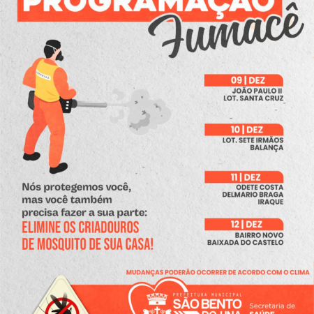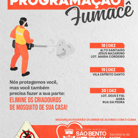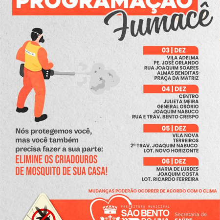 ⚠️ A Prefeitura de São Bento do Una, através da Secretaria de Saúde, informa o cronograma de ação do FUMACÊ no Município/ Período de 03 a 06/12. 🚨O trabalho na luta contra os mosquitos vetores não pode parar! 📲Semanalmente, postaremos […]