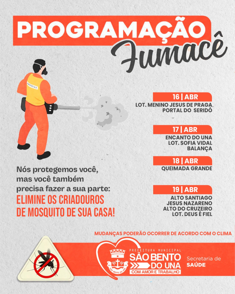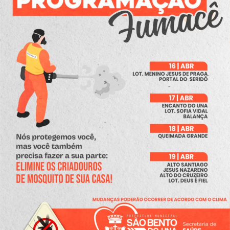 A Prefeitura de São Bento do Una, através da Secretaria de Saúde, informa o cronograma de ação do FUMACÊ no Município/ Período de 16 a 19/04. O trabalho na luta contra o mosquito da Dengue não pode parar! É importante […]