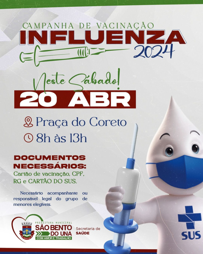 ATENÇÃO, POPULAÇÃO!!! A Prefeitura de São Bento do Una, através da Secretaria de Saúde, informa que a VACINAÇÃO CONTRA A INFLUENZA será ofertada neste SÁBADO, NA PRAÇA DO CORETO, das 8h às 13h. DOCUMENTOS NECESSÁRIOS E INFORMAÇÕES ADICIONAIS: •Cartão de […]