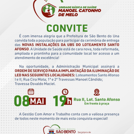 Vamos começar a semana com uma notícia massa pra vocês encherem os olhos: no PRÓXIMO DIA 8, a partir das 19h, a Prefeitura de São Bento do Una vai entregar as NOVAS INSTALAÇÕES DA UBS DO LOTEAMENTO SANTO AFONSO E […]