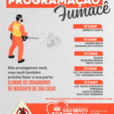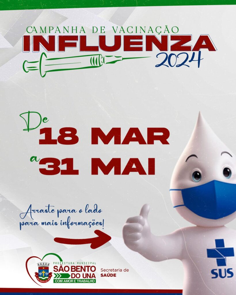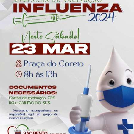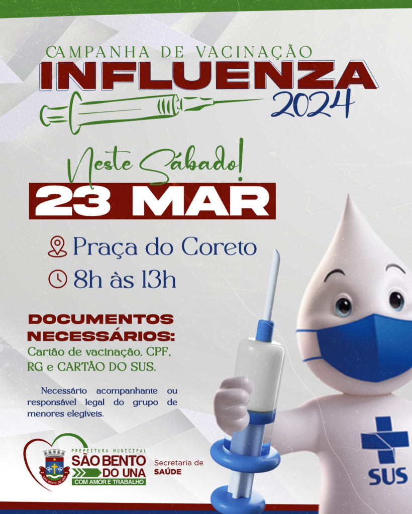 ATENÇÃO, POPULAÇÃO!!! A Prefeitura de São Bento do Una, através da Secretaria de Saúde, informa que a VACINAÇÃO CONTRA A INFLUENZA será ofertada no próximo SÁBADO, NA PRAÇA DO CORETO, das 8h às 13h. DOCUMENTOS NECESSÁRIOS E INFORMAÇÕES ADICIONAIS: •Cartão […]