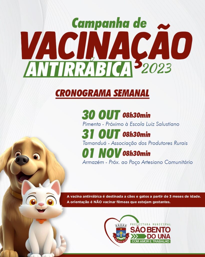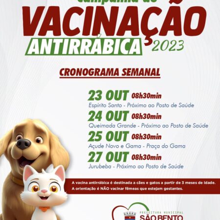 Entre os dias 23 e 27 de outubro, a Prefeitura de São Bento do Una iniciará a CAMPANHA DE VACINAÇÃO ANTIRRÁBICA PARA CÃES E GATOS, gratuitamente, conforme consta na imagem. ATENÇÃO!!! A vacina antirrábica é destinada a cães e gatos […]