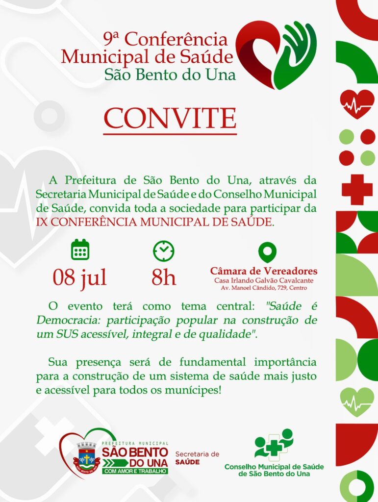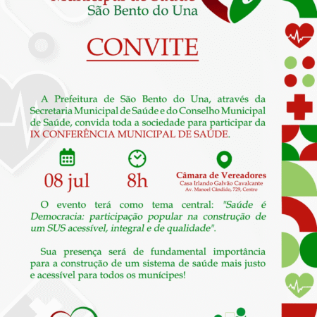 ATENÇÃO, POPULAÇÃO!!! A Prefeitura de São Bento do Una, através da Secretaria Municipal de Saúde e do Conselho Municipal de Saúde, convida toda a sociedade para participar da IX CONFERÊNCIA MUNICIPAL DE SAÚDE. O evento será realizado no dia 08 […]