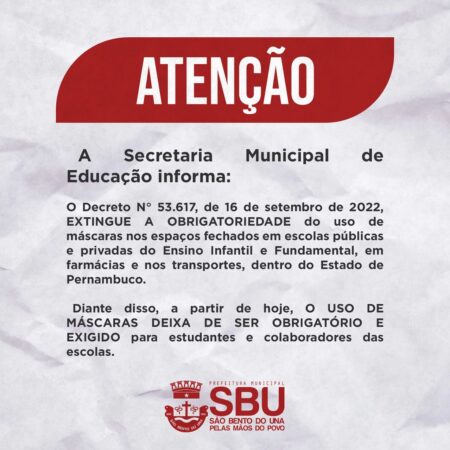 ATENÇÃO, POPULAÇÃO!!! A Secretaria Municipal de Educação informa: O Decreto N° 53.617, de 16 de setembro de 2022, EXTINGUE A OBRIGATORIEDADE do uso de máscaras nos espaços fechados em escolas públicas e privadas do Ensino Infantil e Fundamental, em farmácias […]